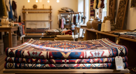 A neat stack of colorful, hand-woven rugs with intricate geometric patterns sits on a wooden table in a textile shop. The background shows a loom and other hanging fabrics, suggesting an artisan workspace or boutique store. The image focuses on the texture and craftsmanship of traditional carpet making.
