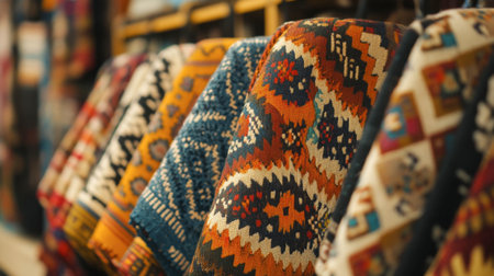 Vibrant mexican serape textiles displayed outdoors during sunset. That the image is generated using AI.