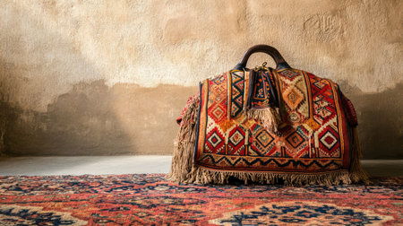Discover a vintage bag featuring intricate patterns and rich textures, perfect for adding an artistic touch to any interior space or travel adventure.