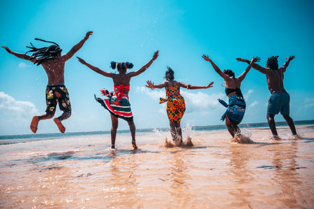 Local people with typical kenyan clothes dancing on the beach