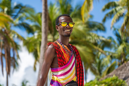 Zanzibar, Tanzania - December 01, 2019: African man masai dressed in traditional clothes standing near the ocean on the sand beach of Zanzibar island, Tanzania, East Africa, close up