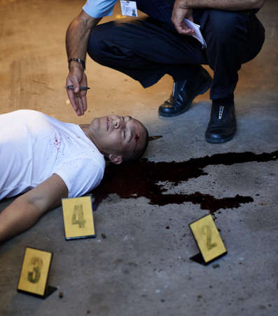 A dead man holds a police pistol in his bloody hand on a wooden background of a table or floor.