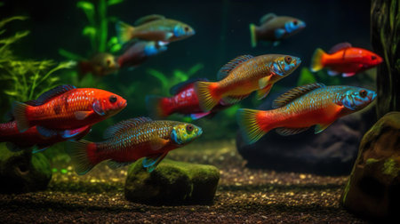 Colorful freshwater fish swimming gracefully in an aquarium with vibrant lighting