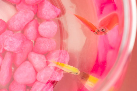 This vibrant freshwater fish glides gracefully through a clear aquatic environment, showcasing its delicate fins and scales against a backdrop of colorful pebbles.