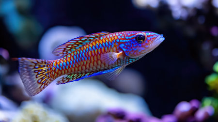 A beautiful wrasse fish with vibrant rainbow patterns swimming in an underwater paradise.