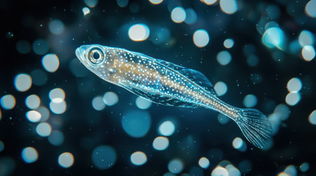 A glowing lanternfish swimming alone in the dark ocean abyss.