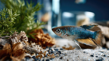 A vibrant and colorful freshwater fish glides effortlessly through its serene underwater habitat, surrounded by pebbles and aquatic plants.