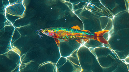 A vibrant fish glides through crystal-clear water, reflecting sunlight in a serene natural environment. The scene captures the beauty of underwater life.