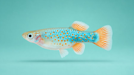 A small fish with blue and orange spots swims in a tank. The fish is swimming in a clear blue tank with a green background