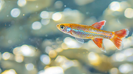 A vibrant freshwater fish gracefully swims through clear blue water, showcasing colorful scales against a blurred, shimmering backdrop of aquatic beauty.