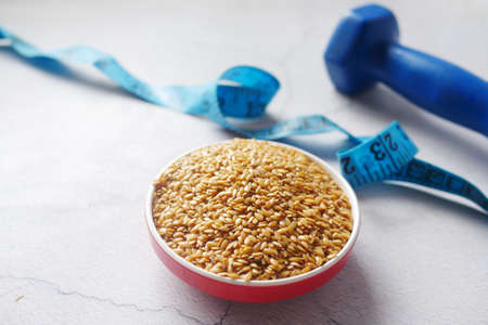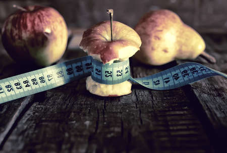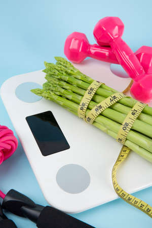 Weight scale and measuring soft tape close up image. Weight loss concept