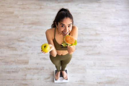 Above view of happy young Indian woman holding apple and hamburger, standing on scales