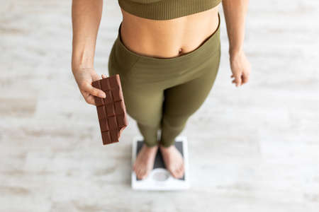 Diet breakdown and unhealthy nutrition. Above view of millennial Indian woman holding chocolate bar on scales, closeup. Unrecognizable lady having cheat meal, losing control, eating junk food