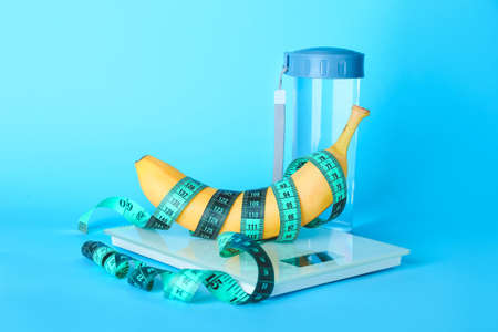 Ripe banana, measuring tape, bottle of water and scales on color background. Weight loss concept