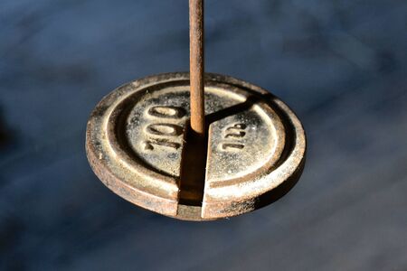 Old metal weights on a dark background. Selective focus. Toned.
