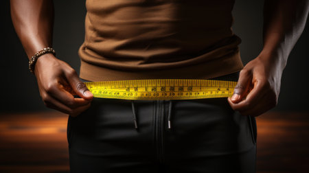 young man measuring his waist with a tape measure, close up.