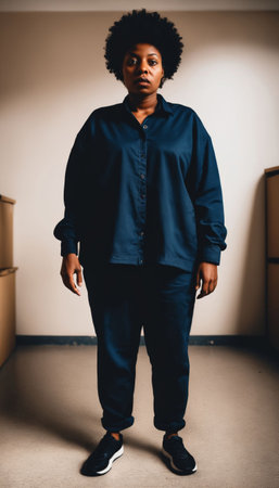 Portrait of young slim woman standing in giant black pants isolated over yellow background. Weight loss concept