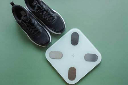 Image of toddler shoe on top of a weight scale. Weight loss concept