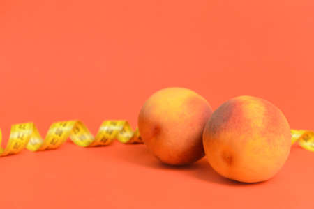 Fresh juicy peaches and measuring tape on color background. Breast augmentation concept