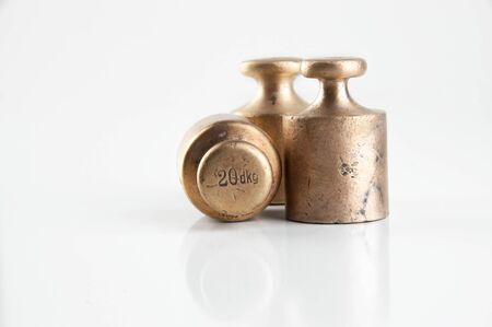 Antique bronze weights for scales on white background. Kitchen decor, food photography props.