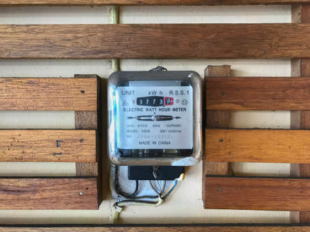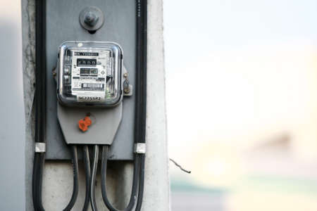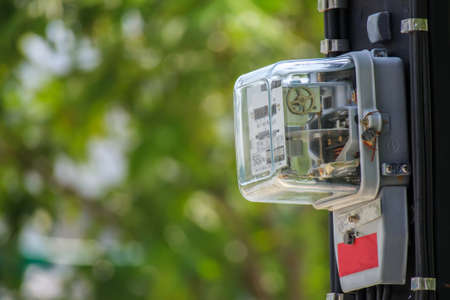 Samut Prakan, Thailand - April 21 2020 : electric power meter on electric pole in the front of house background. electricity meter 220 Volt, 15(45) A, 400 rev/kWh