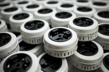This close-up image captures the detailed design of electrical outlets mounted on a vibrant blue panel, emphasizing industrial features and modern electrical functionality.