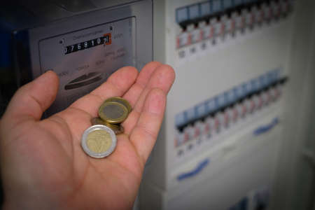 in one hand are several euro coins in front of a three-phase meter