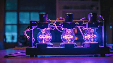 Glowing purple electricity bolts in glass tubes in a science lab.