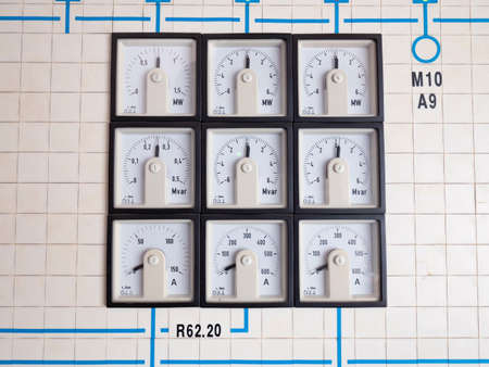 Information deck in a power plant. Analog devices show on the scale of electricity production the supply to the grid.