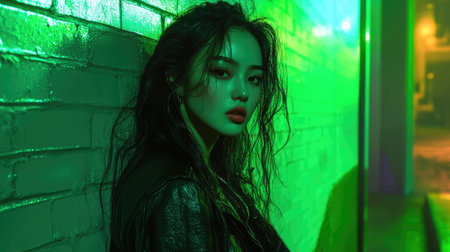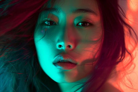 Close up portrait of millennial pretty korean woman with long hairstyle with neon light. Hipster teenager in studio
