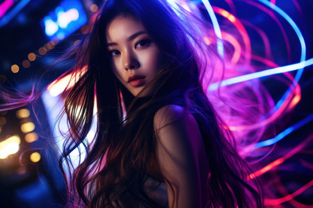 Portrait of a beautiful Asian woman with colorful lights in the background