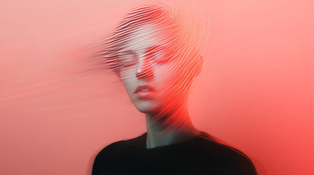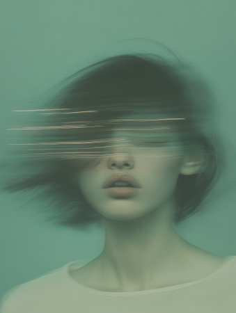 Close up portrait of a young woman featuring double exposure with glitch art elements