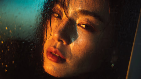Young woman looks out a rain-covered window at night. A melancholic mood is conveyed.