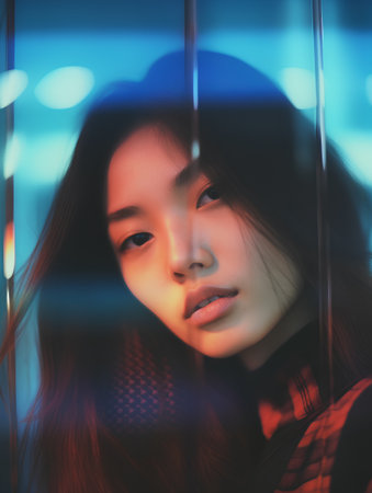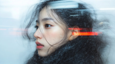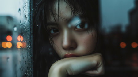A contemplative Asian woman looks out a window, her dark hair framing her face. Blurred city lights reflect on the glass, creating a dreamy, ethereal atmosphere.