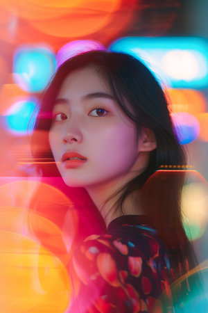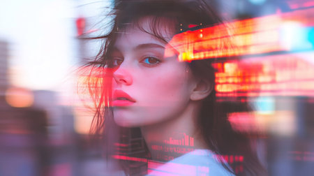 A captivating portrait of a woman with a soft focus, blending with the vibrant, blurred lights of a city at dusk. Evokes a sense of mystery and urban beauty.