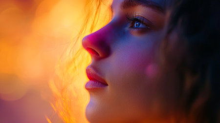 An enchanting closeup photograph of a young woman, beautifully illuminated by warm, dreamy hues of sunset