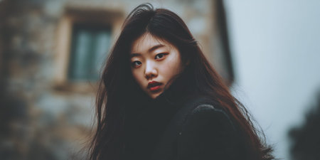 A young Asian woman with long, dark hair and red lipstick looks directly at the camera with a serious expression. She is wearing a dark coat and is outdoors, with a blurred building in the background.