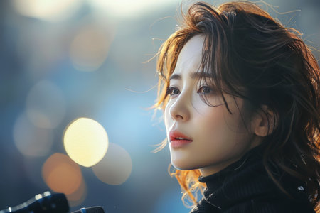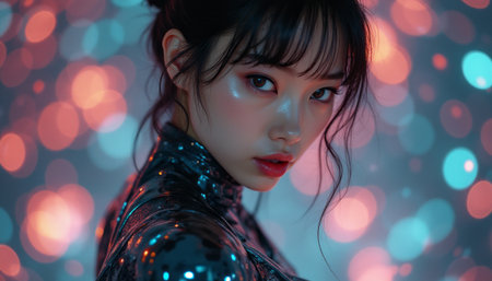 Captivating portrait of a woman with shimmering skin against a bokeh backdrop