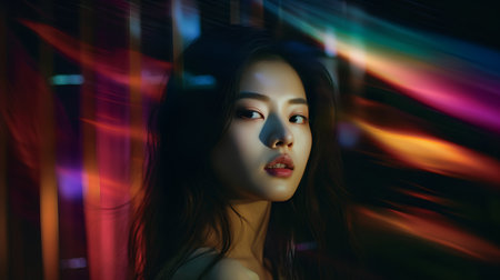 Young woman posed with luminous light trails, combining beauty and movement in a vibrant and ethereal setting.