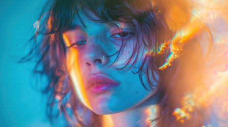 This enchanting portrait showcases a young woman with colorful hair illuminated by soft, gentle light, creating a captivating and dreamy atmosphere for artistic projects.