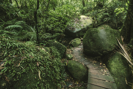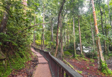 Moss covered footpath in the dense rainforest of Kubah National Park, West sarawak, Borneo, Malaysia. Toned image.