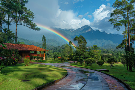 Stunning view of a rainbow arching over Vila Germanica Park, showcasing a picturesque mountain backdrop, vibrant greenery, and a quaint red-roofed house.