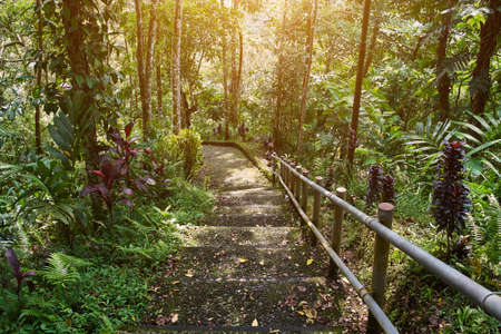 Hiking path stairway in the green jungle or forest.