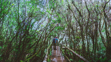 forest with wooden walkways nature of the trees and misty environment in the deep forest Landscapes, scenery, trails, trekking and idyllic on winter in Asia, Doi Inthanon, Chiang Mai, Thailand.