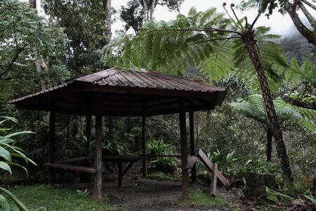 Old elevated walkway through jungle. Rainforest in Sri Lanka.
