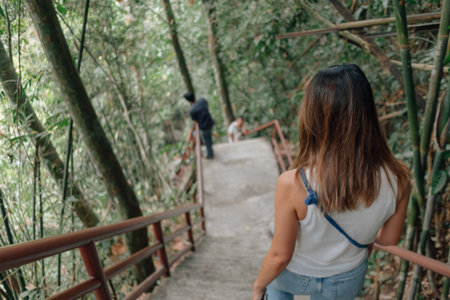 Asian woman walking at the stairs in the outdoor forest
