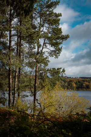 Scenic view of the Kyle Rhea through the pine trees, a strait splitting Skye from the Scottish mainland near Kylerhea village on the east coast of the Isle of Skye, in the Scottish Highlands
