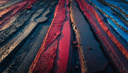 Abstract textured cracked surface with red blue and black stripes Clear details and vibrant colors enhance vi...