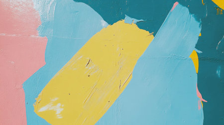 An abstract artwork featuring layers of blue, pink, and yellow colors in a dynamic composition, Layer different textures on top of each other to create a unique, multi-dimensional canvas texture