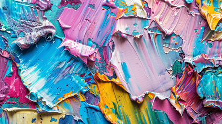 A painting with a lot of different colors and textures. The painting is abstract and has a lot of different shapes and lines. The colors are bright and bold, and the textures are rough and uneven